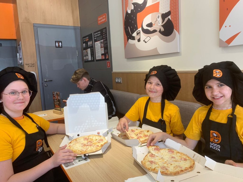 Второй отряд был на мастер-классах в «Додо Пицца Руза». Вначале ребята выбрали, какую пиццу они будут готовить. Затем сотрудники заведения рассказали о технологии приготовления. После инструктажа дети под присмотром пиццмейкера приготовили себе свою пиццу. На выбор у ребят — пепперони, сырная и с ветчиной.