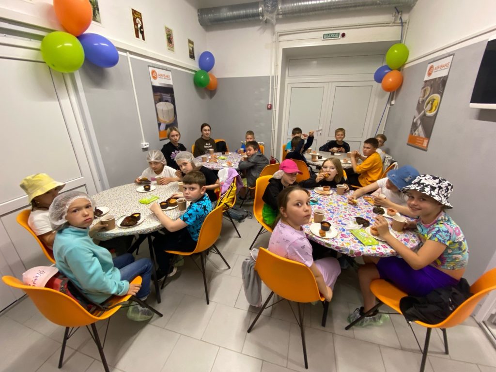 Третий отряд посетил творческие мастер-классы в демонстрационно-обучающем центре «AIR-BAKE». Детям рассказали об истории появления маффинов и имбирных пряников, о профессиях, которые тесно связаны с кондитерским делом, и пищевом оборудовании для фабрик-кухонь, кондитерских, пекарен и хлебозаводов. После они разделились по занятиям на две группы. Первая посетила мастер-класс по изготовлению маффинов с шоколадом и смородиной. Кстати, их дети готовили с нуля и сами замешивали тесто. Вторая группа отправилась декорировать имбирные пряники. После они поменялись. Каждый участник занятий изготовил по 3 маффина и пряника. Затем ребят ждал мастер-класс по изготовлению мороженого. Им рассказали о технологии приготовления и ингредиентах, а после дали возможность самим изготовить десерт.