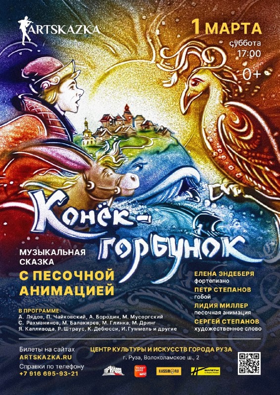 Центр культуры и искусств Рузы приглашает всех желающих на музыкальное представление 1 марта в 17.00. Загляните в сказку под звуки гобоя и фортепиано. Вас ждёт музыкально-литературное погружение в сказочный мир, где живут герои Петра Ершова — Иван и Конек-горбунок. Там, посреди ночного поля во ржи, мы услышим, как звучат звёзды – это будет «Лунный свет» Клода Дебюсси. Путешествие ляжет навстречу удивительным чудесам: горящей ослепительным светом, как огнем, Жар-птице, громадной и страшной Чудо-юдо рыбе-кит. На её хвосте сыр-бор шумит, на спине село стоит. Ну и как в русской то сказке, да без прекрасной Царь-девицы и счастливого конца? Однако удастся ли Ивану выйти живым из кипящего котла с молоком? Все сказочные герои оживут на большом экране в красочных картинах из песка, которые будут рождаться прямо на ваших глазах. Добрый сказочник Сергей Степанов бодро заведет сказочный лад, а музыкальная подборка из произведений русских композиторов создаст атмосферу народного волшебства.