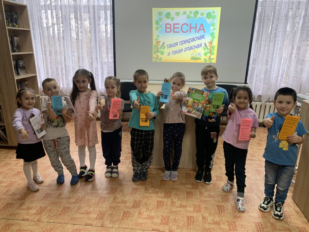 Библиотекарь рассказала ребятам о мерах безопасности весной, о том, что погода в это время года ещё не устоявшаяся, и нельзя забывать, что ещё не лето. Вместе проговорили, какие правила безопасности необходимо соблюдать повседневно.