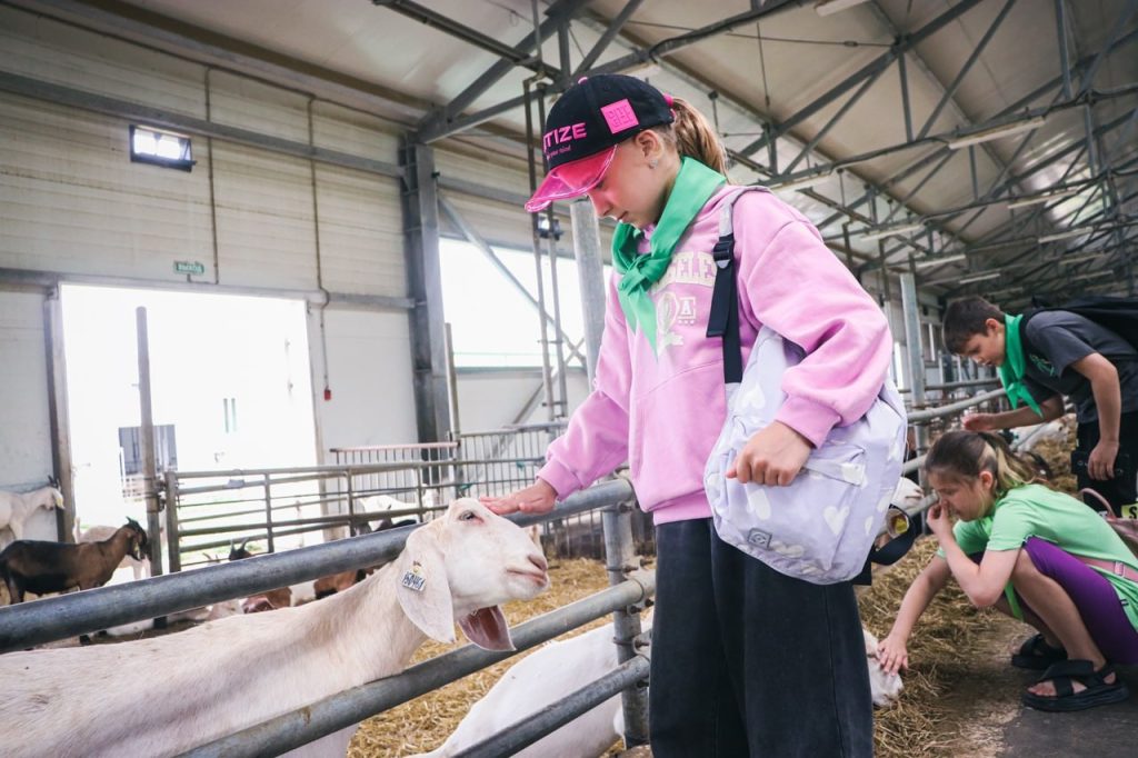 Затем дети направились к животным. На ферме живут почти 2000 коров, примерно столько же овец, а еще огромное количество коз. Всех их разделяют на молочные и мясные категории. Каждое животное можно было погладить, правда, не каждое давалось. Козы то – совсем другая история – сами прибегали к воспитанникам и ласкались. Если бы не было перегородок, наверное, прыгали бы к ребятам на руки. Особенно привлекли внимание новорожденные козлята и телята.