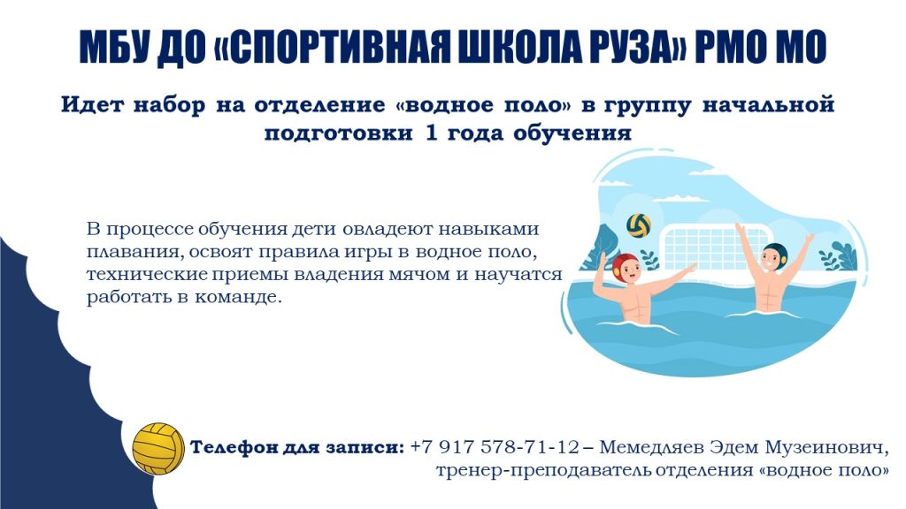 Также проводится набор мальчиков и девочек 2016-2017 годов рождения в группу начальной подготовки отделения водного поло. Дети овладеют навыками плавания, освоят правила игры в водное поло, технические приёмы владения мячом и научатся работать в команде.