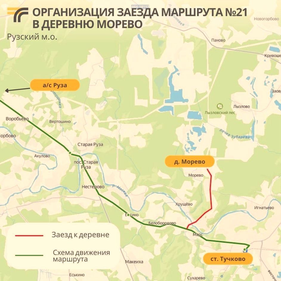 «Для комфорта жителей округа маршрут №21 «Руза – Колюбакино» с 16 августа будет заезжать в деревню Морево. Автобусы будут отправляться из Морево в сторону Рузы в 08:27 и 19:07, в сторону Тучково – в 09:25 и 19:10. На маршруте действуют льготы по соцкартам жителей Подмосковья и Москвы», – написал Александр Анатольевич в своём Телеграмм-канале.