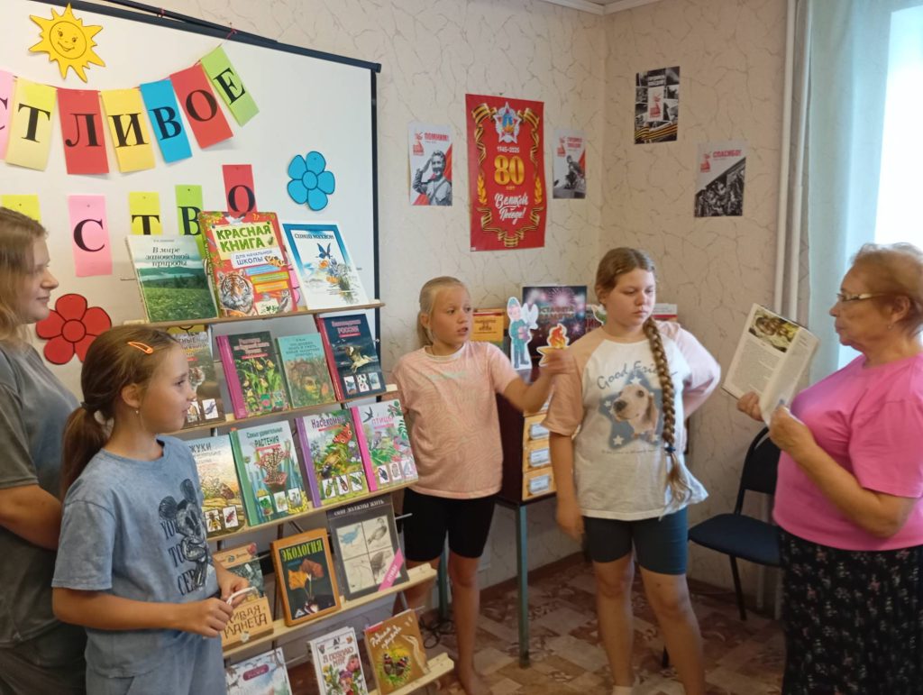 Библиотекарь рассказала ребятам, что такое Красная книга и почему возникла необходимость в её создании. У книги красная обложка, а все страницы разноцветные. Школьники изучили, кто «живёт» на разных страницах и узнали, какие животные, растения и птицы находятся на грани вымирания.