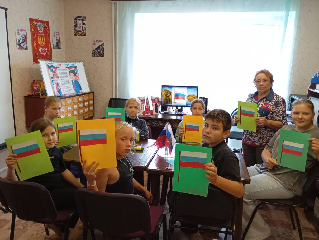 Библиотекарь рассказала юным жителям о многовековой истории российского флага, о государственных символах, как они появились и как менялись в течение многих веков.