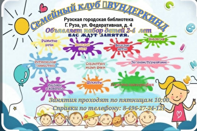 Рузская городская библиотека ведёт набор в семейный клуб «Вундеркинд» на комплексные развивающие занятия для родителей с детьми 2-4 лет для их интересного и активного досуга.