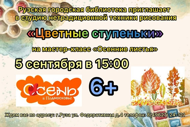 В студии нетрадиционной техники рисования «Цветные ступеньки» Рузской городской библиотеки 5 сентября состоится мастер-класс «Осенние листья». Начало в 15 часов.