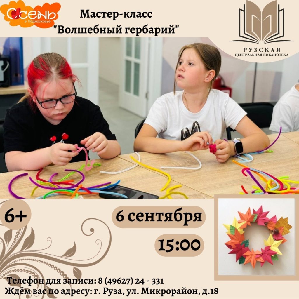Рузская центральная библиотека приглашает всех ребят в творческую мастерскую «Фабрика идей». 6 сентября в 15:00 состоится мастер-класс «Волшебный гербарий». Вместе мы научимся создавать красивый гербарий, узнав для себя новые техники работы с бумагой.