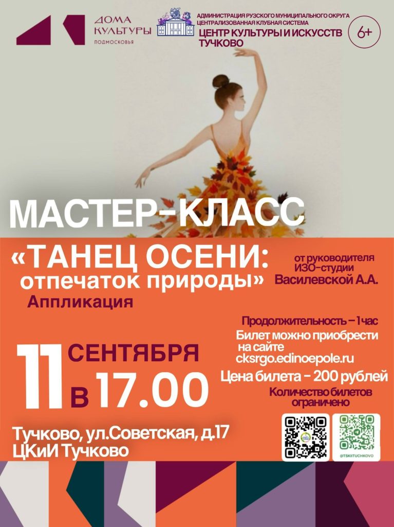 Центр культуры и искусств Тучково приглашает на мастер-класс «Танец осени: отпечаток природы» — аппликация. Ждем всех желающих 11 сентября с 17.00 до 18.00.