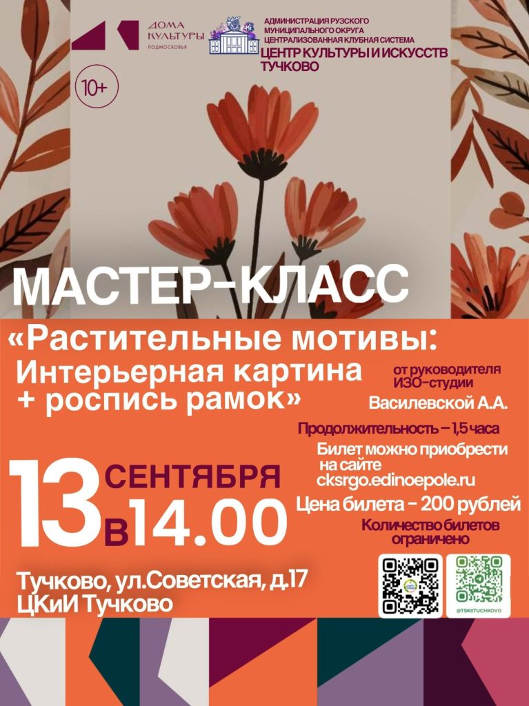 Центр культуры и искусств Тучково анонсирует проведение мастер-класса на тему «Растительные мотивы: интерьерная картина + и роспись рамок». Данное мероприятие состоится 13 сентября в период с 14:00 до 15:30, предоставляя участникам уникальную возможность углубиться в искусство создания живописных композиций и оформления рамок. Мастер-класс будет вести Анна Василевская, высококвалифицированный руководитель изостудии, обладающая многолетним опытом в области изобразительного искусства и педагогики.