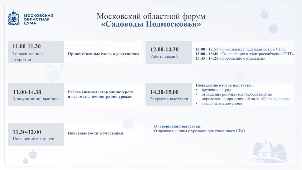 1 октября 2025 года с 11.00 до 15.00 по адресу: Московская область, г.о. Щёлково, усадьба «Гребнево», планируется проведение Московского областного форума «Садоводы Подмосковья».