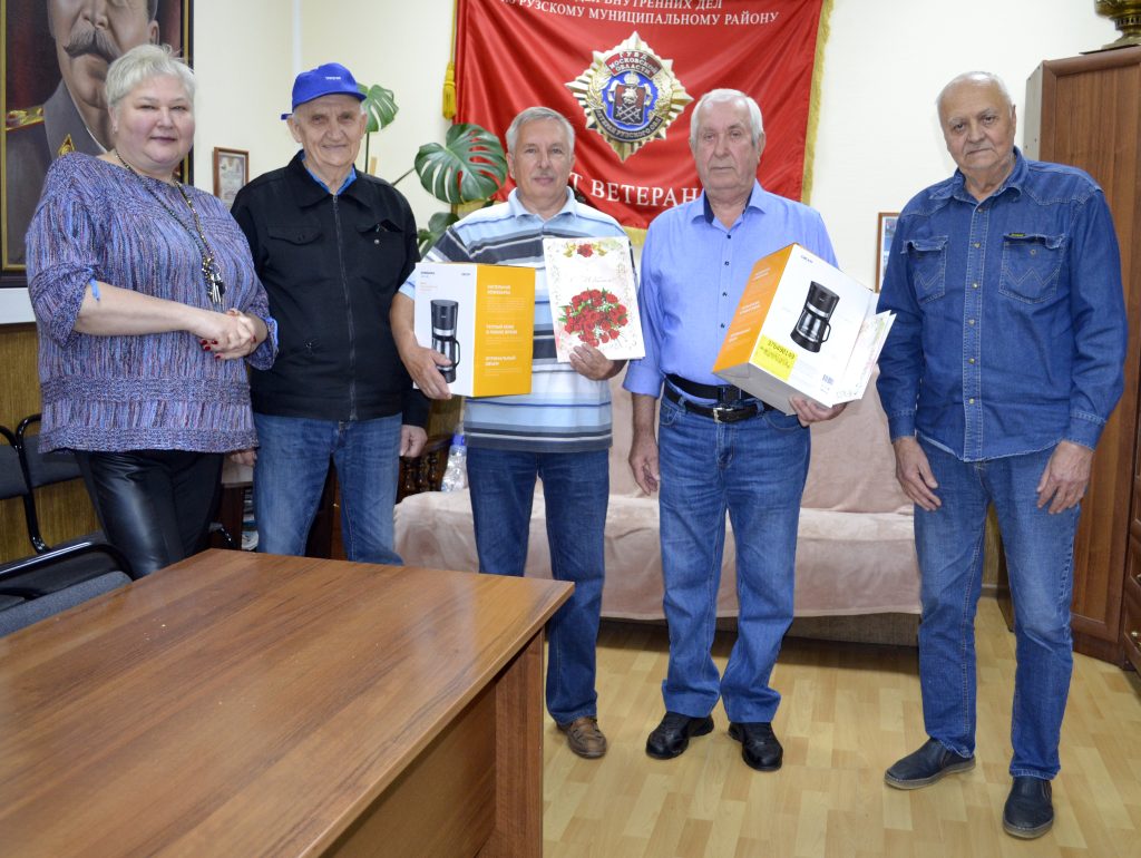 В музее истории Рузской милиции юбиляров тепло встретили представители ветеранской организации, бывшие сослуживцы, в том числе сотрудники бухгалтерии ОМВД. Подполковник внутренней службы в отставке Елена Сковердяк зачитала приветственные адреса и вручила коллегам ценные подарки – кофеварки.