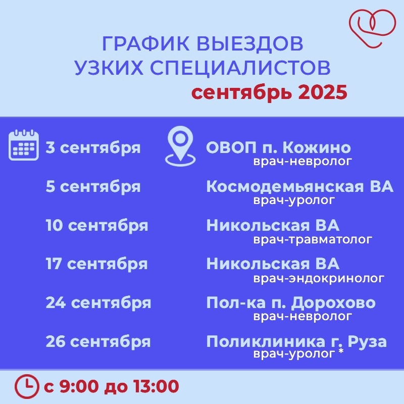 График выездов узких специалистов по подразделениям Рузской больницы на сентябрь 2025 года: