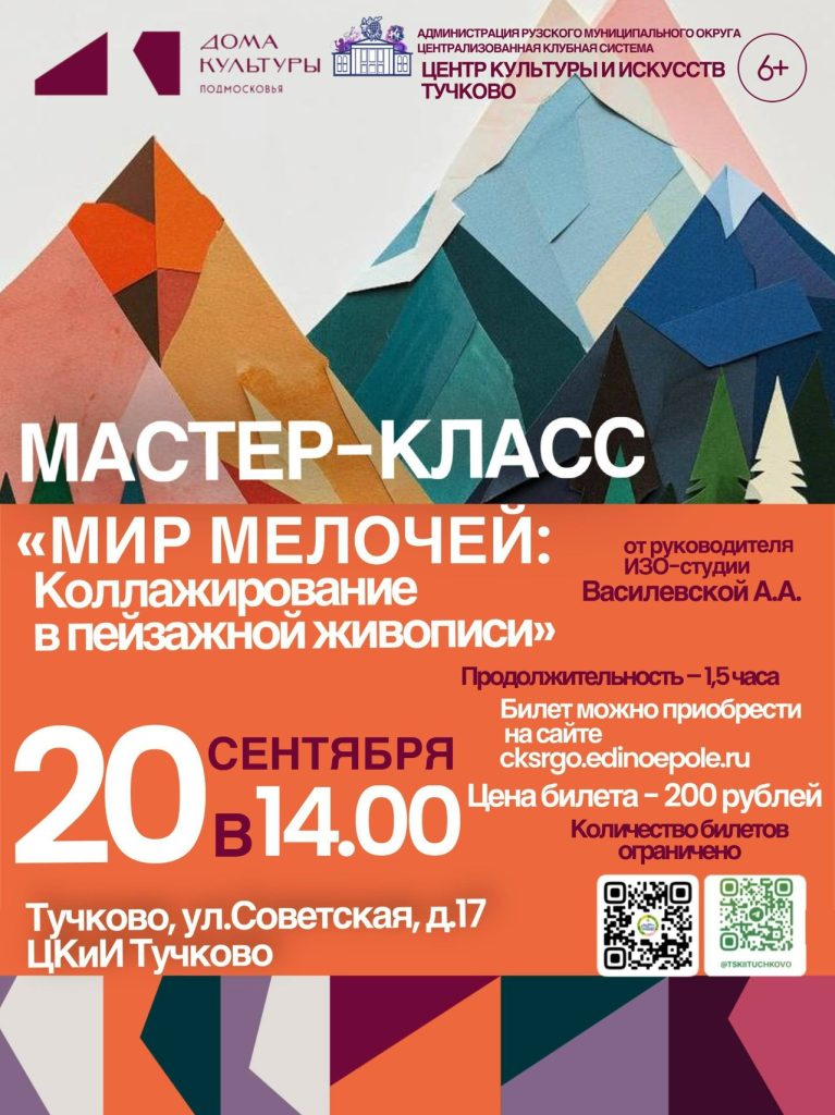 Центр культуры и искусств Тучково приглашает на мастер-класс «Мир из мелочей: коллажирование в пейзажной живописи». Занятие состоится 20 сентября с 14.00 до 15.30. Руководитель студии Анна Василевская, талантливый и опытный педагог с большим стажем.