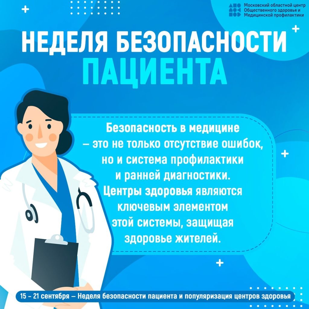 С 15 по 21 сентября Министерство здравоохранения Российской Федерации объявило Неделю безопасности пациента и популяризации центров здоровья, приуроченную к Всемирному дню безопасности пациента, который отмечается 17 сентября.