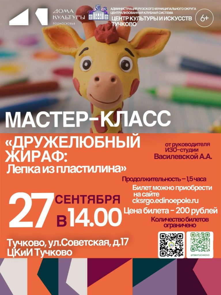 Центр культуры и искусств Тучково приглашает на мастер-класс «Дружелюбный жираф: лепка из пластилина». Мероприятие состоится 27 сентября с 14:00 до 15:30.