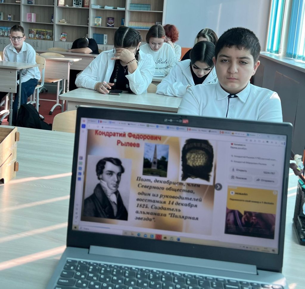 Ребята ознакомились с жизнью и творчеством великого русского поэта, общественного деятеля и участника декабрьского восстания 1825 года. Также школьники узнали, какие события происходили в России начала XIX века, чем знамениты представители поколения декабристов, почему декабристское движение стало важной страницей истории нашей страны. В завершении занятия восьмиклассники прочитали стихотворение Рылеева «Гражданин».