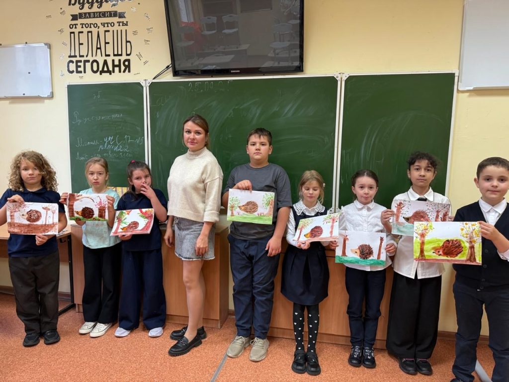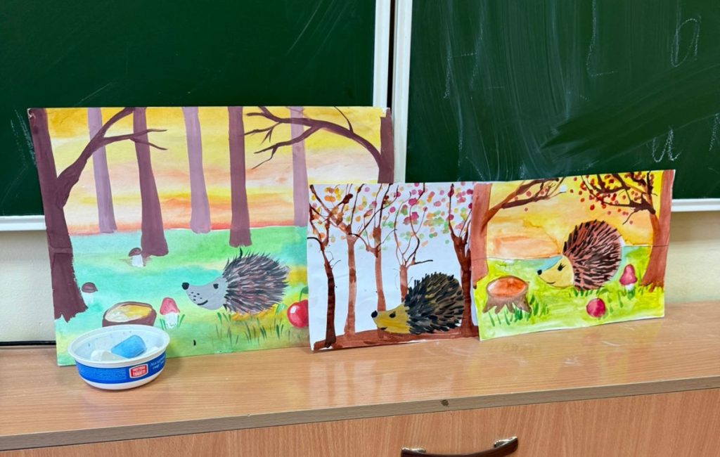 Работы учеников, выполненные в контексте осенней тематики, отличались оригинальностью и высоким уровнем эстетического восприятия. Изображение ёжика, гуляющего по осеннему лесу, стало центральным элементом творческого задания. Каждый ребенок интерпретировал данную тему по-своему, что позволило создать уникальный спектр художественных решений, демонстрирующих разнообразие индивидуальных подходов к визуализации природного мира.