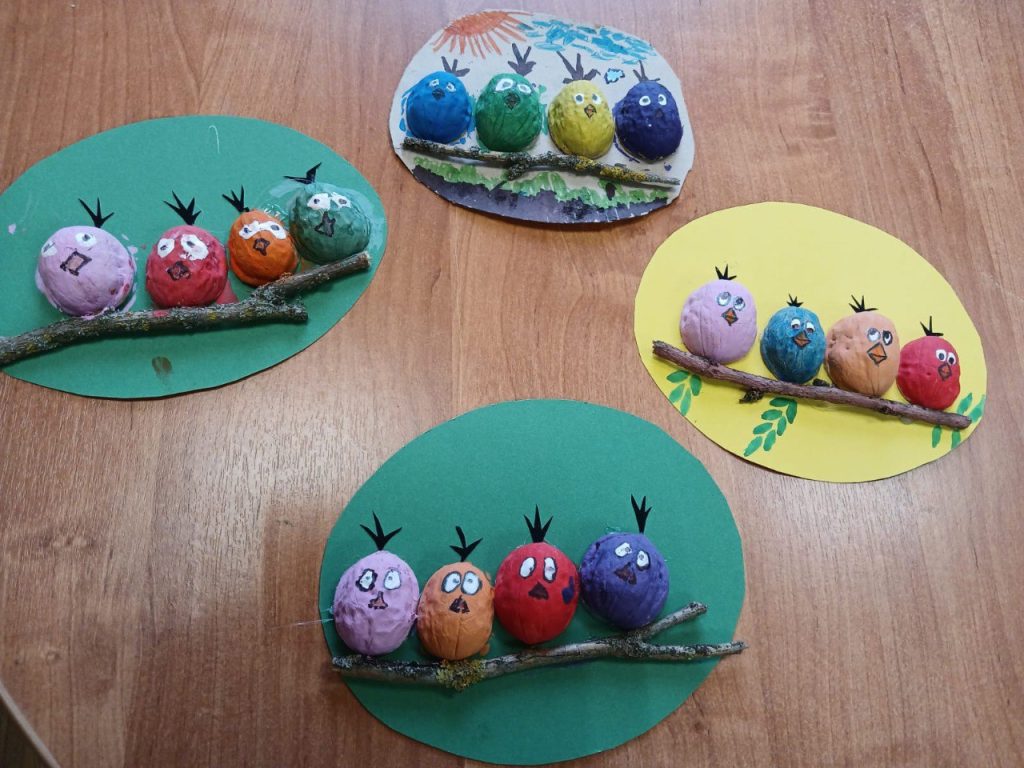 Ребята мастерили из скорлупы грецкого ореха милых пташек, сидящих на веточке. Раскрашивали их гуашью и фломастерами.