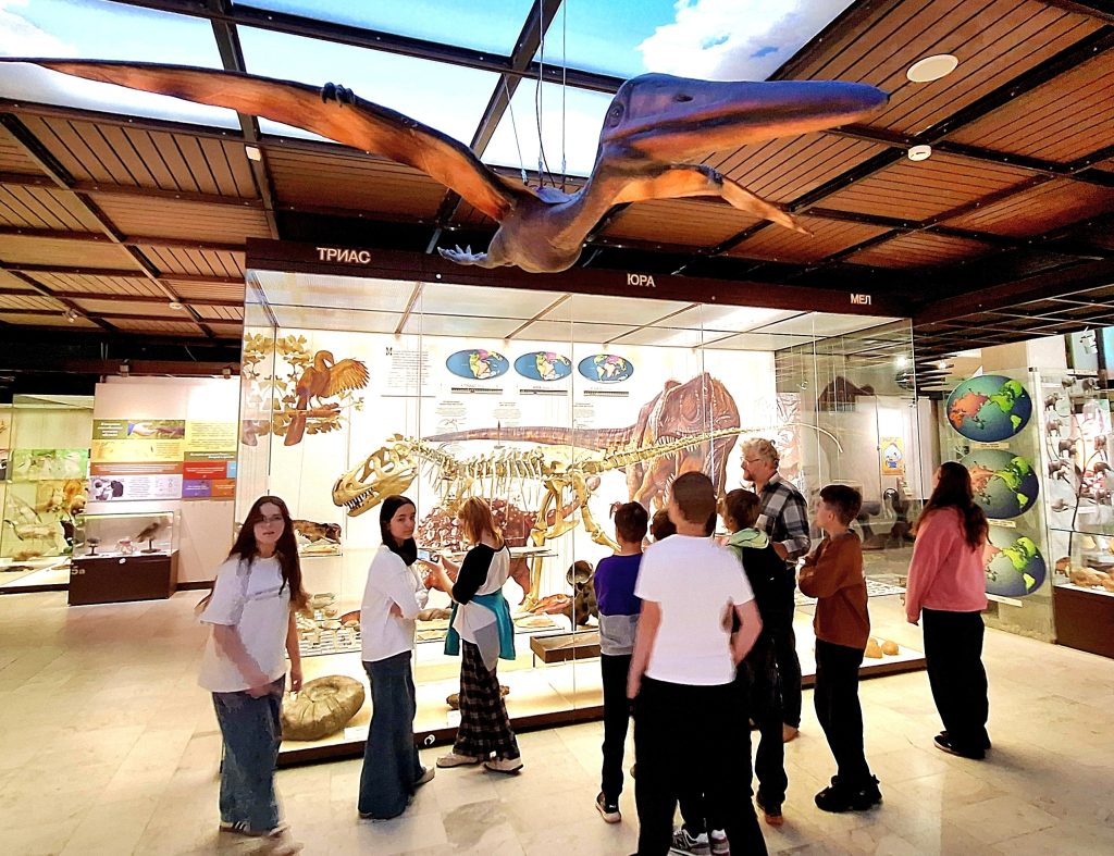 Основная часть экскурсии проходила в зале «Макроэволюция». Ребята увидели уникальные экспонаты: ископаемые останки древних растений и животных, точные копии морских ящеров и наземных обитателей доисторических времён.