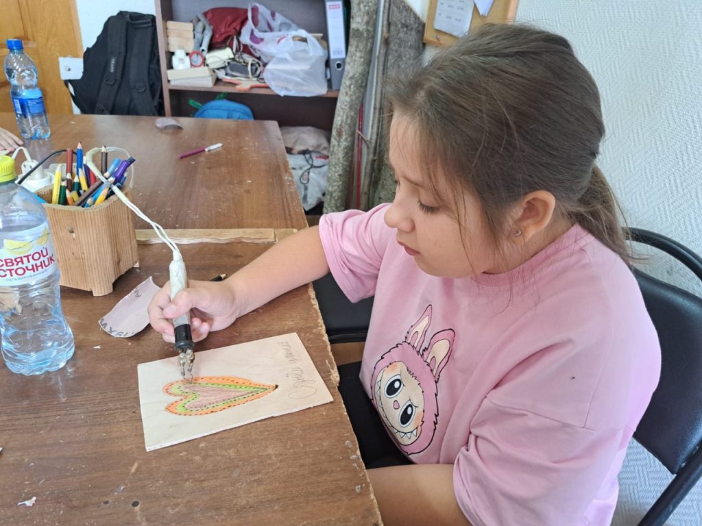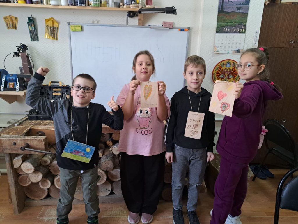 Александр Зайцев поделился с ребятами своими знаниями и навыками по выжиганию. Ребята с энтузиазмом взялись за дело. Они полировали деревянные заготовки, наносили на них рисунки, а затем аккуратно выжигали свои узоры. Некоторые выбрали роспись акриловыми красками, другие предпочли резьбу по дереву. Каждый старался вложить в свой подарок частичку души и тепла.