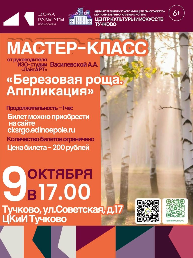 Центр культуры и искусств Тучково приглашает всех желающих посетить увлекательный мастер-класс, который состоится 9 октября с 17:00 до 18:00. В рамках мероприятия участники изостудии «ЛайтАРТ» создадут своими руками красивую аппликацию на тему «Березовая роща».