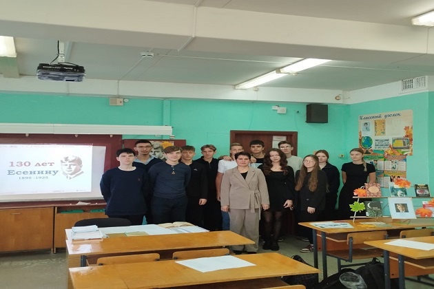 Встреча была посвящена 130-летию великого русского поэта. Библиотекарь прочитала ребятам автобиографию Сергея Есенина, показала фотографии членов его семьи, рассказала, как и где он учился. На уроке прочитали стихотворения «Берёза», «Песнь о собаке», «Вот оно, глупое счастье…», «Собаке Качалова» и «Быть поэтом – это значит то же…».