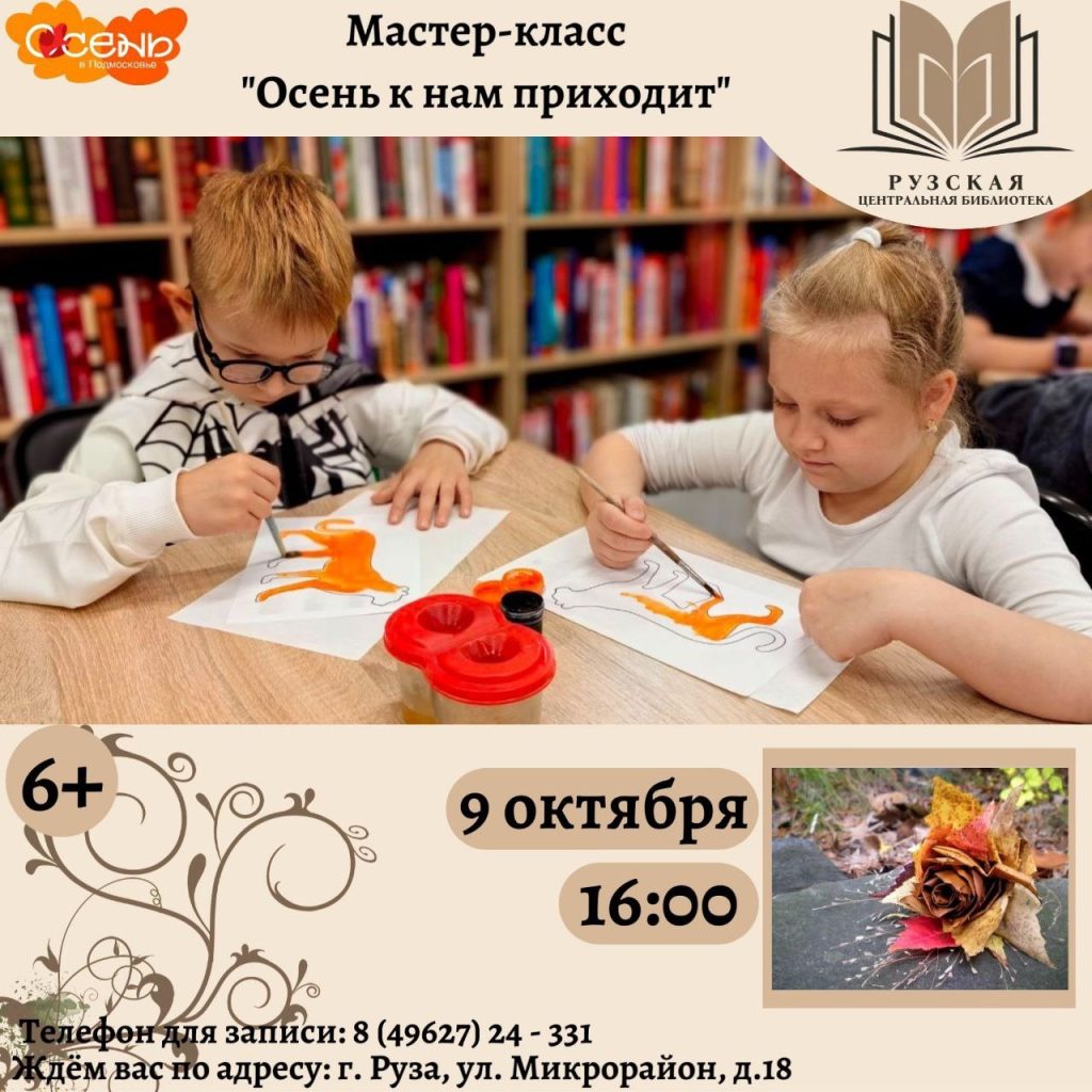 Рузская центральная библиотека приглашает на мастер-класс «Осень к нам приходит», который пройдет 9 октября в 16:00. На мероприятии библиотекарь расскажет о волшебстве осени: как деревья становятся яркими, одеваясь в золотые и красные наряды, и как природа готовится к зимнему времени года.