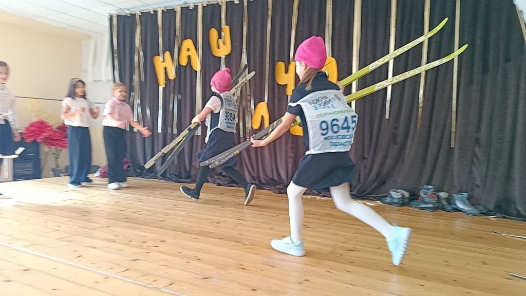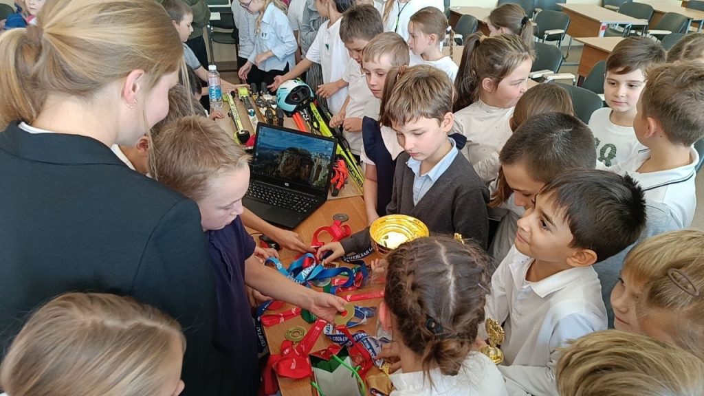 Екатерина ознакомила ребят с экипировкой лыжника и лыжероллера, показала видеофильм с тренировочными моментами, продемонстрировала свои самые ценные награды. Вместе с ребятами, а их было немало, 150 человек, провела разминку и увлекательные смешные эстафеты.