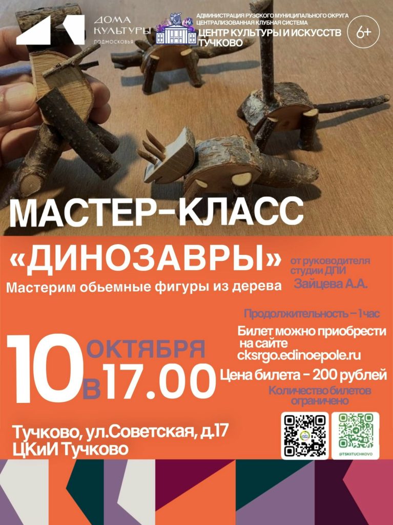 Центр культуры и искусств Тучково приглашает всех желающих на увлекательный мастер-класс «Динозавры» от студии декоративно-прикладного искусства Александра Зайцева. Мероприятие состоится 10 октября с 17:00 до 18:00.