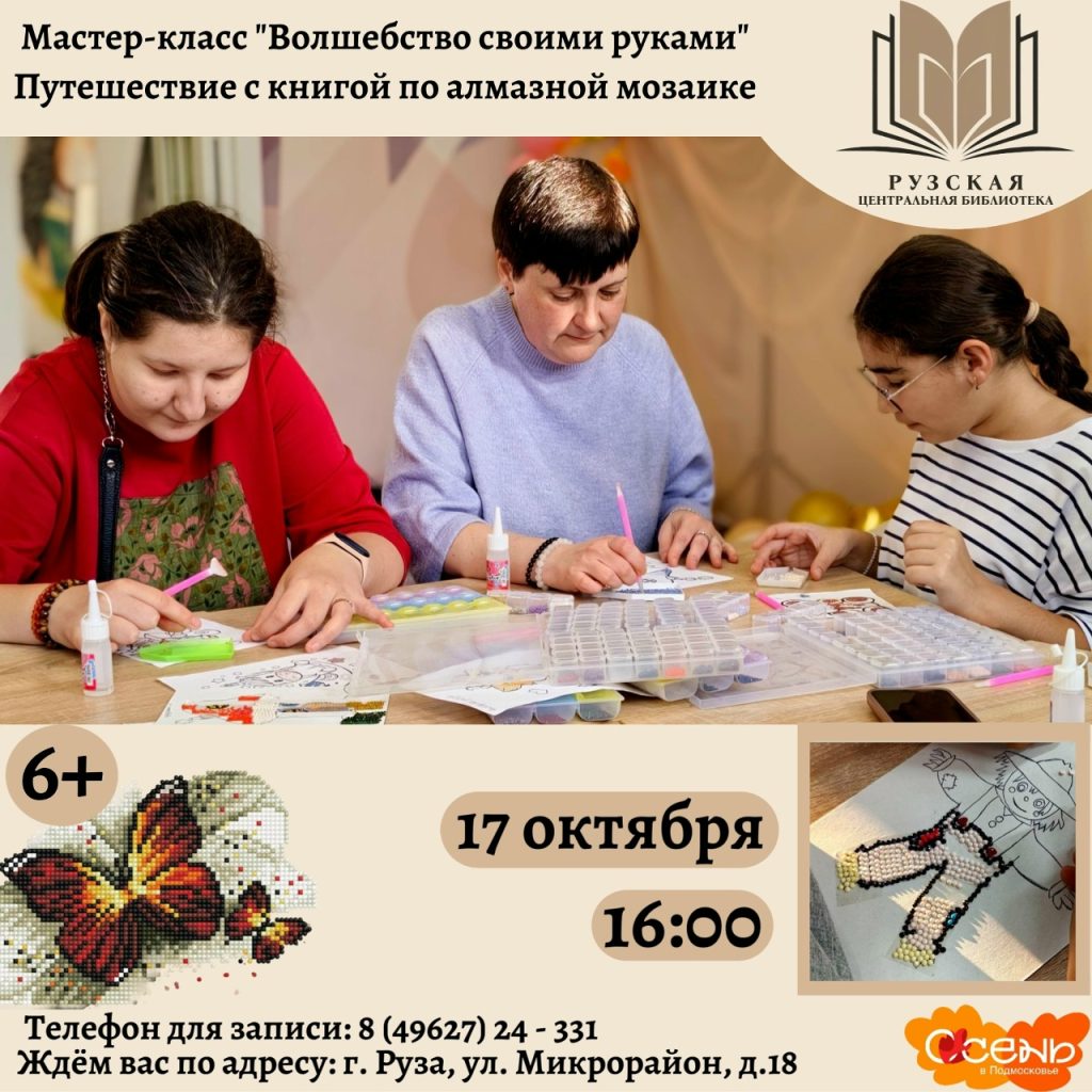 Рузская центральная библиотека приглашает на волшебный мастер-класс «Волшебство своими руками»! 17 октября в 16:00 ждем вас на увлекательное приключение с книгой и алмазной мозаикой.