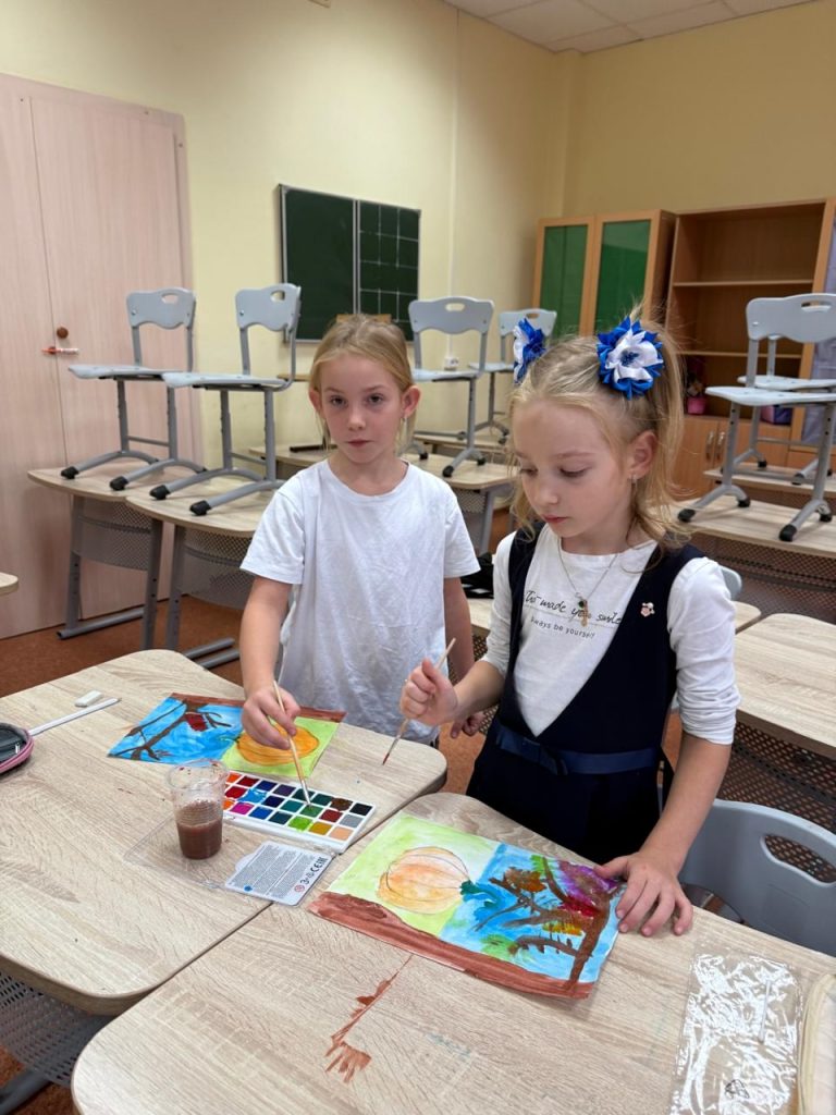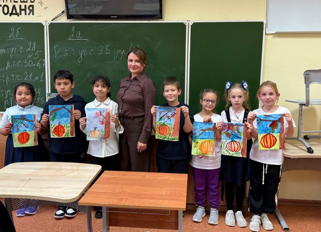Несмотря на дождливую погоду за окном, в классе царила атмосфера творчества и уюта. Ребята создавали красивые осенние пейзажи с тыквами под руководством Оксаны Игоревны.