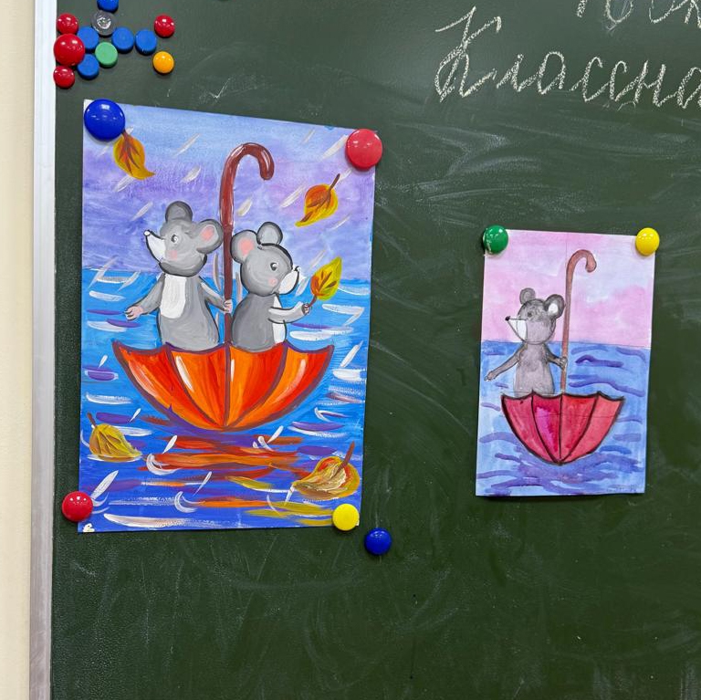 Вместо привычного натюрморта или пейзажа Оксана Игоревна предложила ребятам нарисовать целую историю. Сюжет был незамысловатым, но полным доброты и фантазии: отважный мышонок (а может, и не один) отправляется в плавание по осеннему ручью на настоящем зонтике!