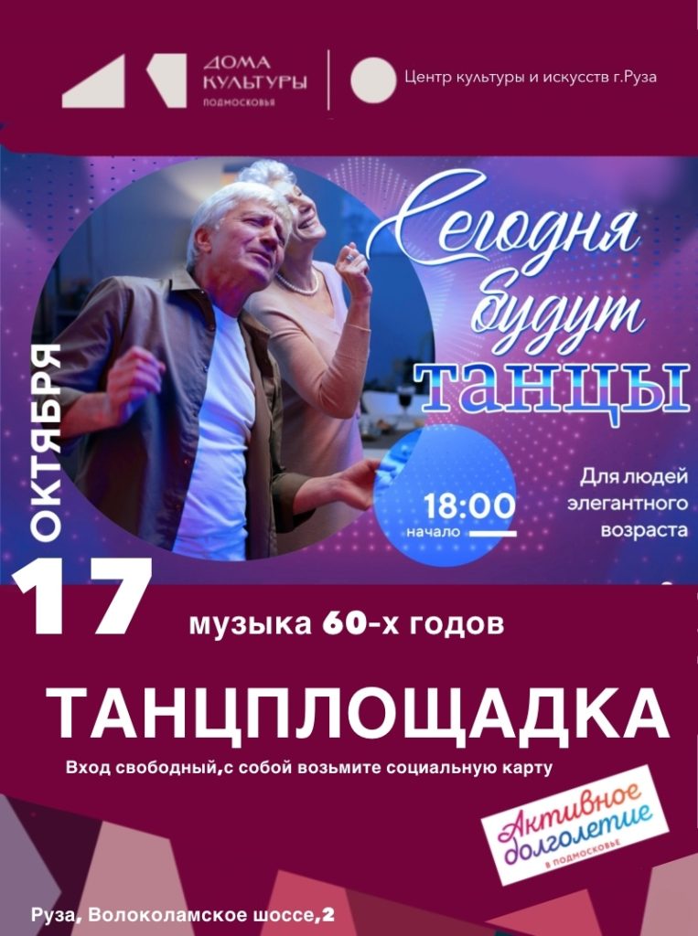 Дорогие друзья, 17 октября, в 18:00 приглашаем в Центр культуры и искусств Рузы на зажигательную танцплощадку.