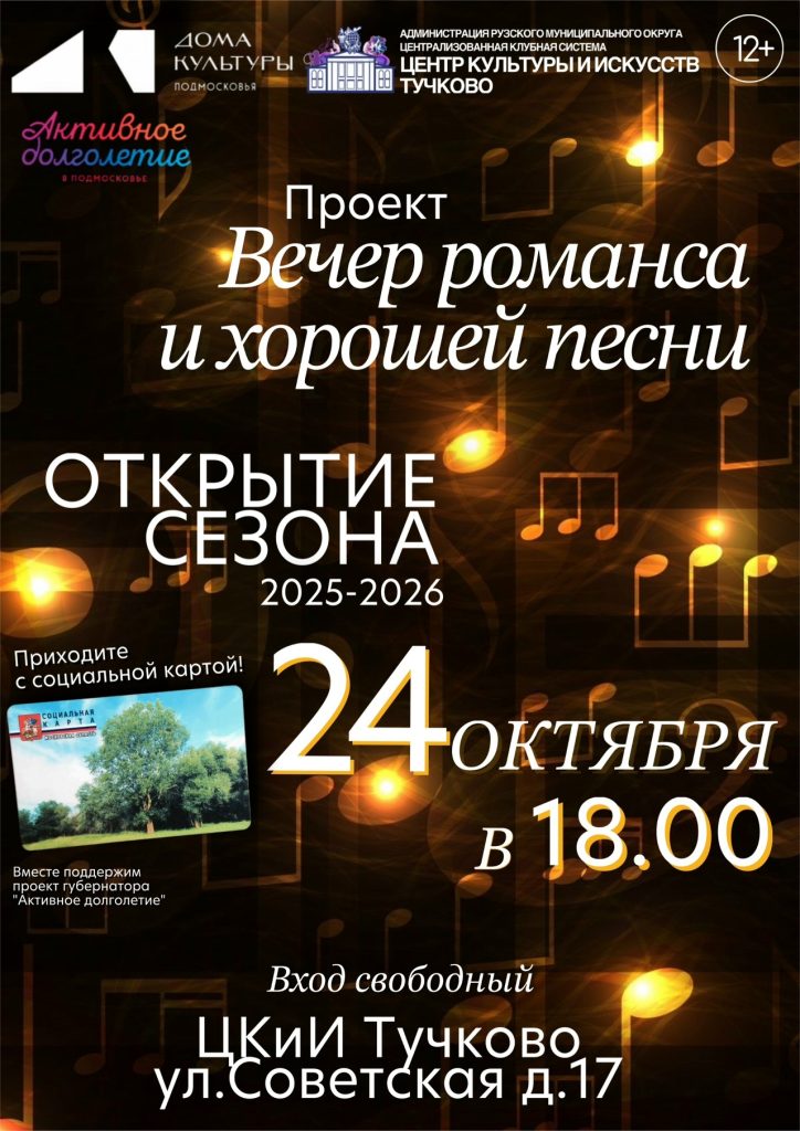 Центр культуры и искусств приглашает вас на открытие творческого сезона в рамках проекта «Вечер романса и хорошей песни». Мы подготовили для вас душевный праздник, наполненный теплыми и любимыми композициями. С нетерпением ждем вас на нашем музыкальном торжестве!