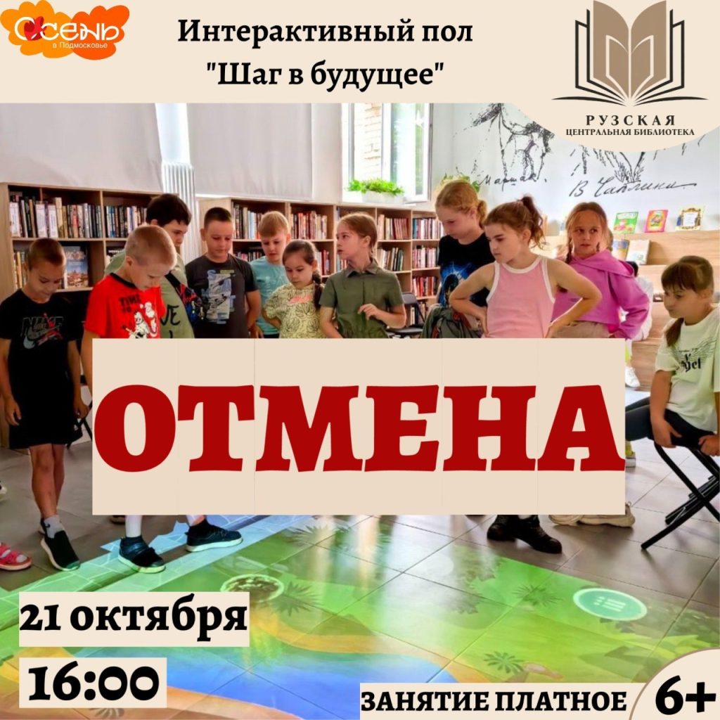 В Рузской центральной библиотеке отменяется занятие «Шаг в будущее» Опубликовано: 21.10.2025 Просмотров: 131 Рузская центральная библиотека обращает ваше внимание, что занятия на интерактивном полу «Шаг в будущее» 21 октября в 16:00 — ОТМЕНЯЮТСЯ. Приносим свои извинения за доставленные неудобства.