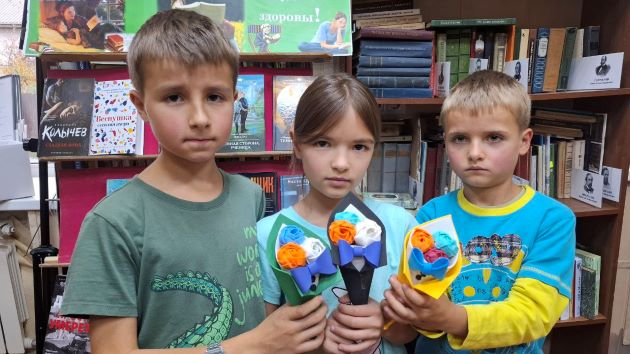 Для соединения деталей использовался термоклеевой пистолет, с которым некоторые читатели справлялись с трудом, но все старались вложить максимум усилий и души в своё творение. Наполнив кулёчки конфетками, ребята закрепили цветы в букете, создавая яркие и праздничные композиции.