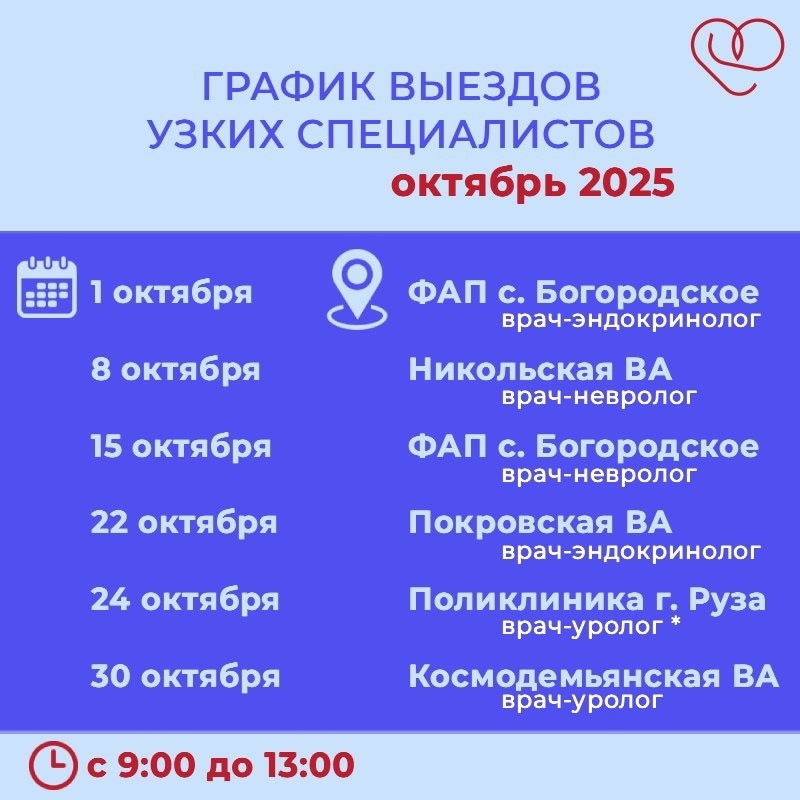 График выездов узких специалистов по подразделениям Рузской больницы на октябрь 2025 года: