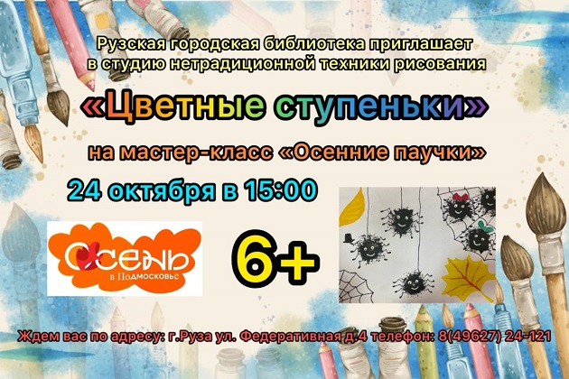 Рузская городская библиотека приглашает в студию нетрадиционной техники рисования «Цветные ступеньки» 24 октября в 15:00 на мастер-класс «Осенние паучки».