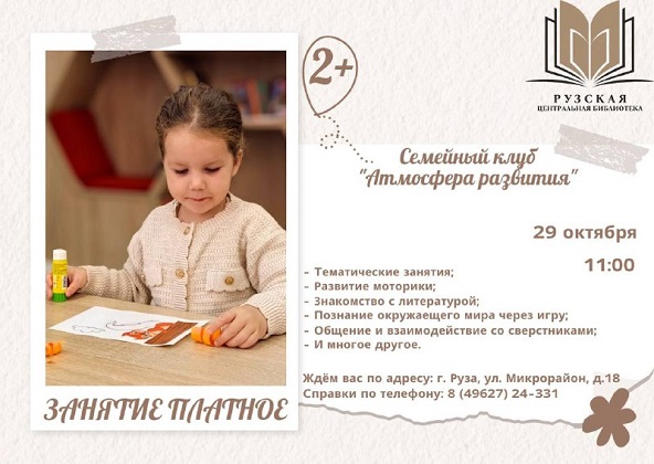 Рузская центральная библиотека приглашает вас в семейный клуб «Атмосфера развития» 29 октября в 11:00.
