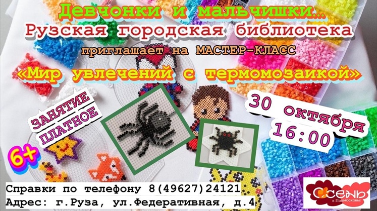 Рузская городская библиотека приглашает детей от 6 лет на увлекательный мастер-класс «Мир увлечений с термомозаикой» 30 октября в 16:00.