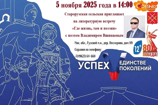 5 ноября 2025 года в 14:00 Старорузская сельская библиотека совместно с подмосковным отделением «Единая Россия» в рамках партийной программы «Успех V единстве поколений» и «Культура малой Родины» приглашает на литературную встречу с поэтом, депутатом Московской областной Думы и ветераном боевых действий Владимиром Сергеевичем Вшивцевым.