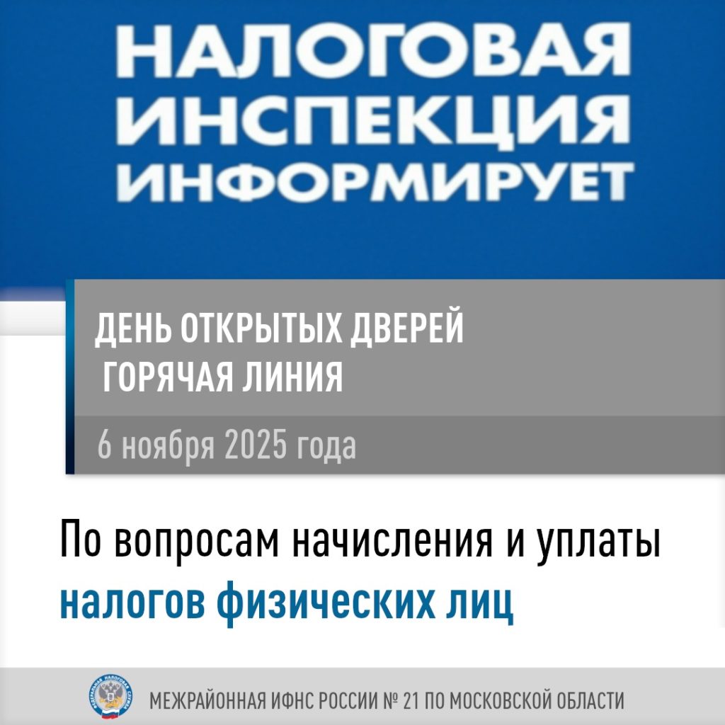 6 ноября в Межрайонной ИФНС России №21 по Московской области будут проведены день открытых дверей и горячая линия по информированию граждан по вопросам исполнения физическими лицами налоговых уведомлений, направленных в 2025 году.