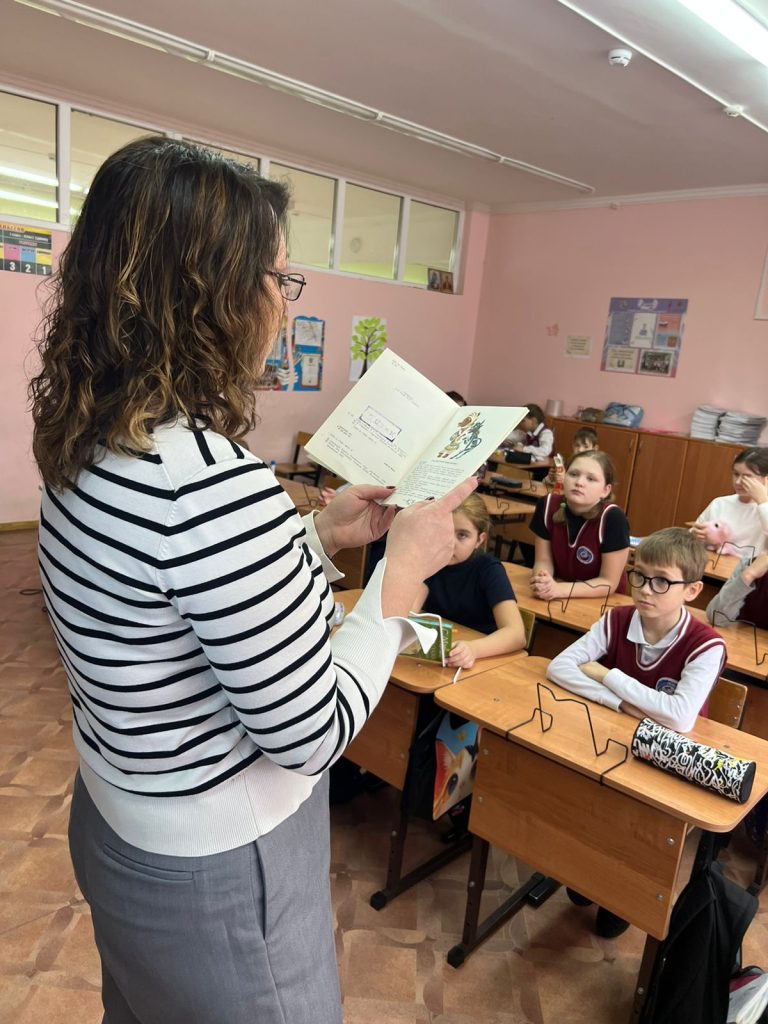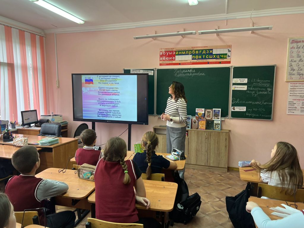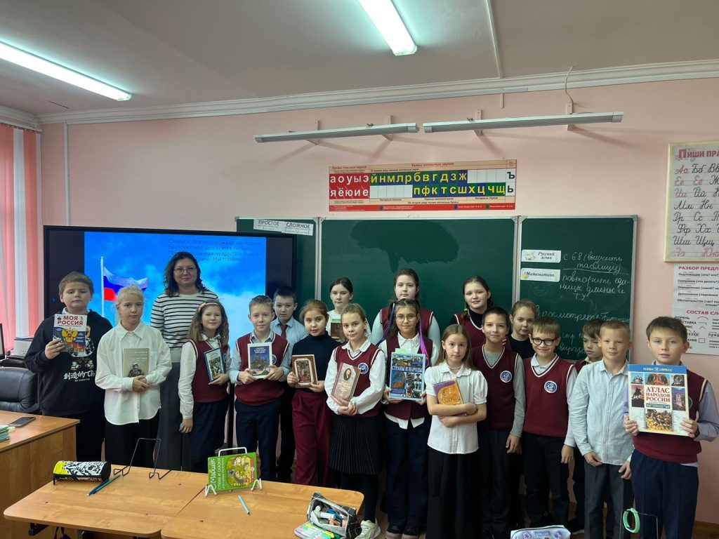Библиотекарь рассказала о Дне народного единства, подготовила книжную выставку, на которой можно было увидеть атлас народов России, издание «Моя Россия. Книга юного патриота», а также «Уральские сказки» П.П. Бажова, «Мордовские народные сказки», «Сказки адыгских народов» и другие. Ученики дружно прочитали стихотворение Н. Майданика «День народного единства».