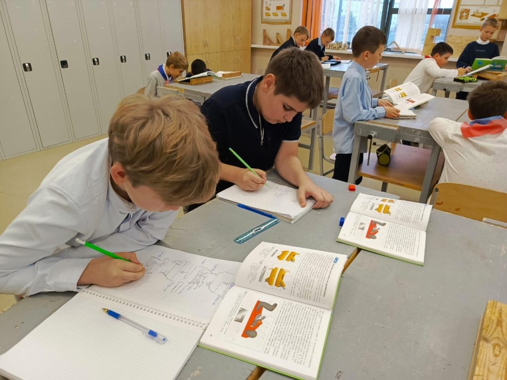 Параллельно в 5 «Г» классе проходило теоретическое занятие, посвящённое строганию заготовок ручным столярным инструментом. Мальчики изучили виды рубанков и их назначение, разобрали последовательность операций при строгании, обсудили типичные ошибки и способы их предотвращения. Особое внимание уделили правильной стойке и хвату инструмента — ключевым моментам, обеспечивающим качественный результат и безопасность работы.