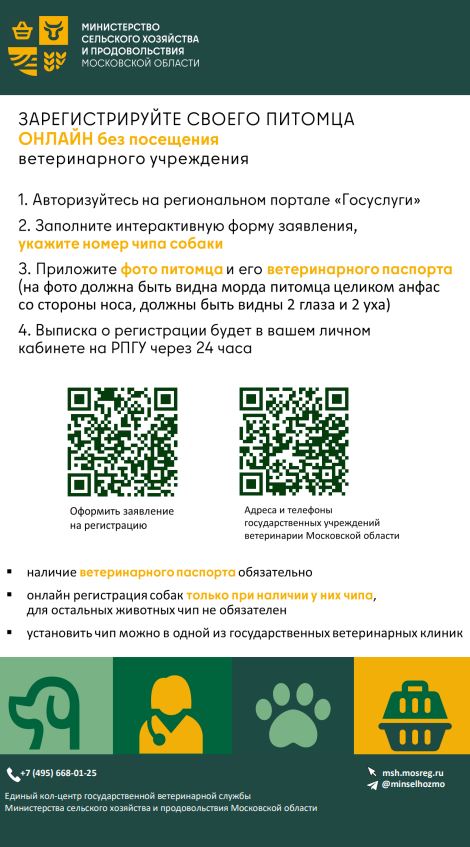 Министерство сельского хозяйства и продовольствия Московской области сообщает, что 25 октября вступили в силу изменения в Порядок регистрации домашних животных на территории региона, утвержденный Постановлением Правительства Московской области № 406-ПП, которые позволяют регистрировать животных онлайн, без посещения ветеринарной клиники (наличие чипа и информации о нём в ветеринарном паспорте является обязательным условием для регистрации собак онлайн).