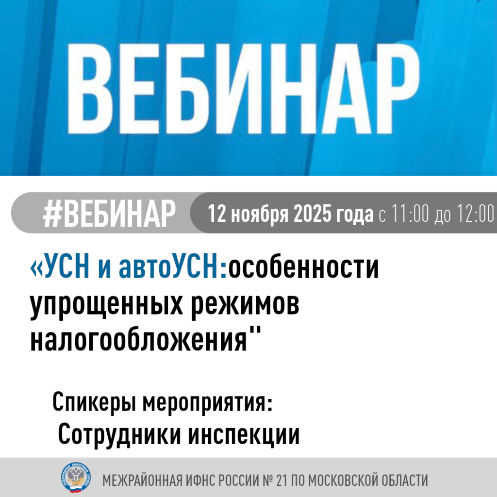 12 ноября с 11 до 12 часов налоговая инспекция проведёт бесплатный вебинар на тему «УСН и автоУСН: особенности упрощённых режимов налогообложения». В качестве спикеров выступят работники Межрайонной ИФНС России № 21 по Московской области.