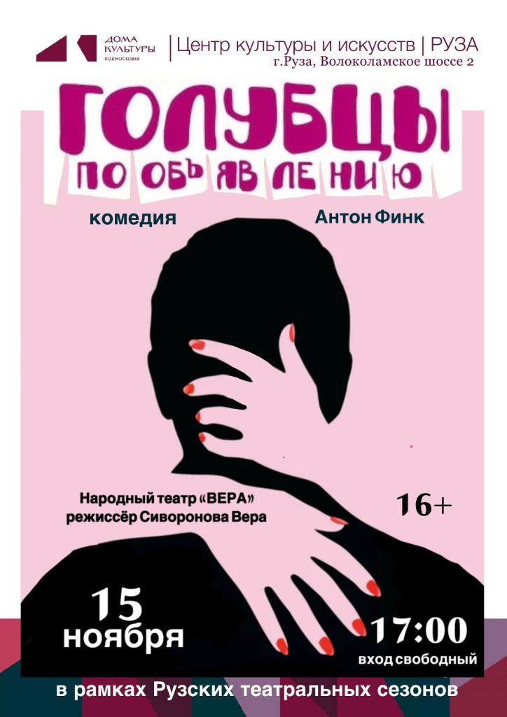 Премьера от Народного театра «Вера»! 15 ноября в 17:00 в Центре культуры и искусств Рузы состоится премьера спектакля «Голубцы по объявлению». Жизнь, что кипит на маленькой кухне, станет темой этого представления. Автор пьесы — Антон Фолк, а режиссёр — Вера Сиворонова.