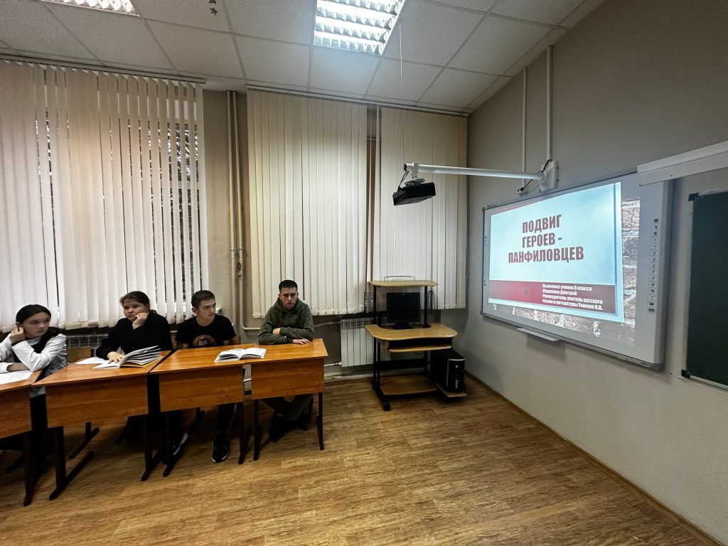 Памятное мероприятие состоялось 13 ноября в школе-интернате. Для учащихся 7-8 классов было проведено воспитательное занятие, посвящённое бессмертному подвигу бойцов из дивизии И. В. Панфилова.