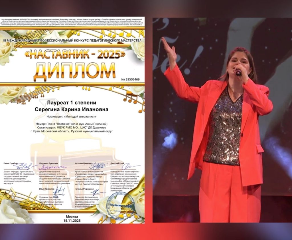 Карина Серёгина – руководитель студии «Комильфо» ДК Дорохово стала лауреатом I степени в номинации «Молодой специалист» на III Международном профессиональном конкурсе педагогического мастерства «Наставник-2025». Это значимое достижение для молодого специалиста, которое подтверждает её талант и профессионализм.